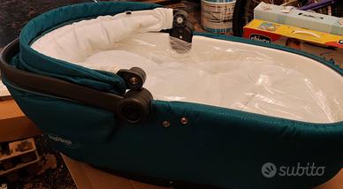 Vendo Trio peg Perego book plus 51 colori verde petrolio usato completo di: navicella come nuova lavata in lavanderia prima di conservare e completa di materassino e cuscino con schienale regolabile, ovetto, borsa e passeggino chiusura a libro. Coprigambe per passeggino o coperta navicella e copriovetto pioggia. In più base d'appoggio con ruote su cui si aggancia sia la navicella che l' ovetto per non tenere in casa il telaio del passeggino. Presenta solo nella chiusura anteriore del passeggino screpolatura della pelle.