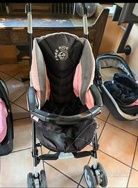Trio Peg Perego composto da passeggino (un po’ scolorito dal sole) ovetto con base di fissaggio, navicella con materasso e cuscino, inclusi accessori parasole e imbottitura + seggiolino auto 15-36 kg Chicco, isofix, con seduta un po’ scolorita dal sole.