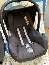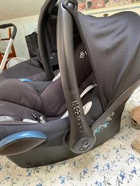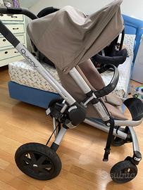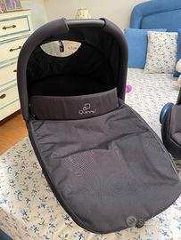 Passeggino Quinny color verde salvia completo di ovetto e navetta colore nero, bellissimo, ideale per passeggiate anche su sterrato. Completo di borsa e porta oggetti da agganciare sotto il passeggino .
