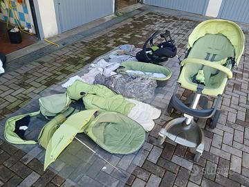 Veneto bellissimo trio della stokke explory verde mela con tanti accessori usato in buone condizioni come da foto. Include: Passeggino, navicella,seggiolino auto con base isofix, pedana, ombrello,2 zainetti,zanzariera, antipioggia, kit invernale con guanti e tante alte accessori che si vedono in foto.