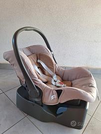 Sistema completo con telaio, culla, ovetto (con supporto auto), passeggino. Colore ecrú. Cerniera parasole del passeggino danneggiata.