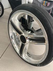 Vendo trio Venicci cosi composto: navicella, ovetto, passeggino, borsa abbinata. Il trio è praticamente nuovo. Tutte le ruote sono state sostituite con ruote nuove (disponibili anche le vecchie come scorta). Unico difetto il manico è leggermente spellato in alcuni punti (vedi foto). N.B. Le foto sono relative solo al passeggino, in quanto navicella e trio sono inscatolati ormai da diverso tempo e sono praticamente immacolati.