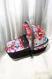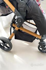 Sistema trio combinato composto da: passeggino e cappottina regolabile, navicelle rigida, seggiolino auto, borsa mamma a doppio fondo rigida con tasca.