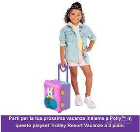 Il playset si apre trasformandosi in un resort a 3 piani nel quale i bambini possono partecipare a infinite attività in vacanza con Polly e gli amici