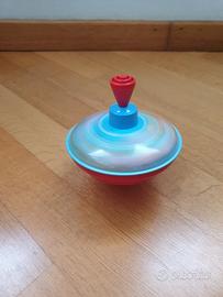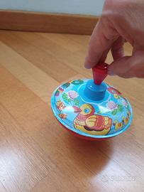 Funziona premendo ripetutamente il manico superiore: l’asta centrale a spirale fa girare la trottola sempre più velocemente. È un giocattolo tradizionale in metallo colorato con decorazioni di anatre.