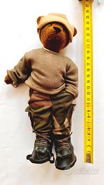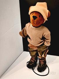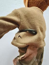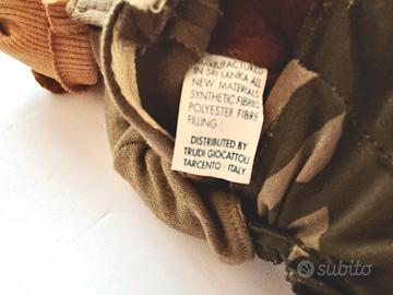TRUDI - Orso di Peluche Vintage: ZAP "Rap on the Street". 25 cm di altezza. Abiti in tessuto, fantasia "mimetica militare" sfilabili: - maglia verde militare - pantaloni con tasche e apertura in velcro; - stivaletti in similpelle nera e lacci; - berretto beige. strada Assente la scatola originale. Compresa l'asta in metallo per esporlo (vedi immagini). NOTA: piccolo foro sulla maglia (come indicato nella foto). Sistemato distaccamento dell'elastico della suola dello stivale destro.