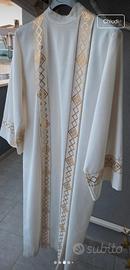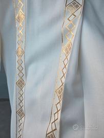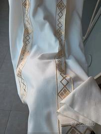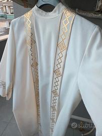 Misure standard Disponibile in tessuto vatican bianco o avorio certificato OEKO-TEX STANDARD 100 Con pieghe davanti e dietro Decorata con gallone bianco/oro sul davanti e sulle maniche Adatta per maschietto e femminuccia