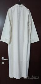 Tunica per la Prima Comunione colore Panna. Chiusura con cerniera dietro. Tessuto po-liestere e viscosa. Modello con quattro piegoni davanti e quattro piegoni dietro. Ciondolo a forma di croce in legno. Misure: larghezza spalle 37 cm, Lunghezza 126 cm, lunghezza manica 55 cm. Include cingolo e ciondolo a forma di Crocifisso in legno. Usato solo 1 volta e ben conservato con cucitura-imbastitura provvisoria eseguita a mano per proteggere i piegoni. Vendo per mancato utilizzo.