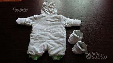 vendo tuta invernale Prenatal ?35, colore bianco con animaletti colorati ricamati e applicati sul davanti e toppe di colore verde anch'esse ricamate ai gomiti, in cotone 100% e caldissima e confortevole imbottitura in poliestere 100%, con guantini, cappuccio, chiusura con doppia zip e piedini staccabili, interno morbido e traspirante in jersey di cotone stampato, per bimbi/e da 1/3 mesi e 53/59 cm di altezza, usato pochissimo, pari al nuovo (vedi foto). valuto anche spedizione, per info gianga 3336020284.