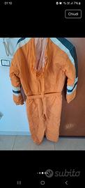 Tuta da neve per bambino di colore arancione. Presenta dettagli in grigio e bianco sulle maniche e sul petto.