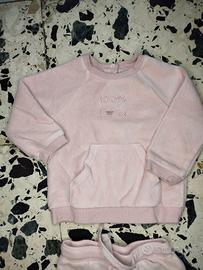 Comoda tutina per neonata in morbido tessuto. - Felpa rosa con stampa 100% love. - Tasca frontale. - Pantaloni coordinati con elastico in vita e laccetti.