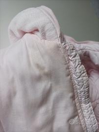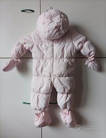 Tutina imbottita rosa chiaro con cappuccio, guantini a manopola e copripiedini staccabili, rivestimento interno in cotone. In ottime condizioni, segnalo solo un leggero alone all'interno come visibile nelle ultime due foto.
