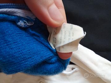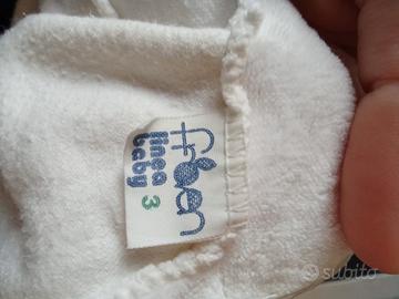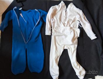 Vendo due tutine per neonati, quella blu Marca Sabina, taglia 2, lana + acrilico, chiusura posteriore con cerniera, senza piedi, tasca sulla gamba in basso. Dimensioni da spalla a spalla 25 cm, lungo 54. Quello bianco marca Fraen Linea baby, taglia 3, abbottonato dietro, dimensioni da spalla a spalla 26 cm, lunghezza 63 inclusi i piedi, cotone + nylon. Vendo anche separatamente