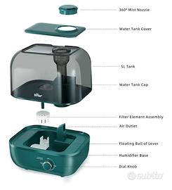 BEAR Umidificatore 5L a Riempimento Dall'alto, 28dB Ultra Silenzioso, Adatto a Bambini e Piante, 35 Ore Di Funzionamento, con Vassoio per Aromi, Ugello Rotante a 360°, Spegnimento Automatico.