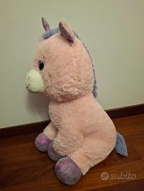 unicorno peluche rosa con zampe e orecchie viola e lucide. altezza 65 cm senza corno e larghezza 30 cm. nesaun difetto e pulito.