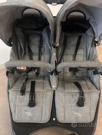 Caratterizzato da tessuti di qualità e dettagli curati in ogni singola parte. Le due sedute sono regolabili autonomamente e le barre frontali si aprono da entrambe le parti, è dotato di capottine parasole per entrambe le sedute e di quattro ruote frontali per garantire una manovra sempre fluida.