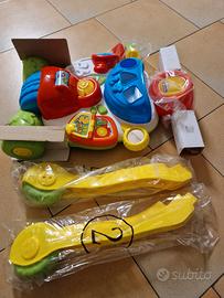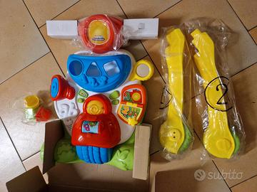 Gioco 2 in 1: un grintoso primi passi a forma di scooter che è anche un centro attività per imparare lettere e numeri in italiano e in inglese. Il cestino frontale dello scooter è un incastraforme non elettronico dove inserire le 3 formine incluse nel gioco. Sviluppa la motricità, il linguaggio e l’immaginazione. Stimola la percezione visiva e uditiva grazie ai 4 tasti interattivi (il clacson, il rullo, la pagina del libro e le ruote) e alla luce sotto al fanalino. Bilingue italiano/inglese. Con tanti suoni e allegre musichette.