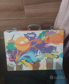 valigetta porta colori con pennarelli pastelli e pastelli a cera, l’attrezzatura all’interno è usata ma in ottimo stato, la valigetta non è del tutto integra: i cardini sono rotti quindi la chiusura non risulta ottimale.