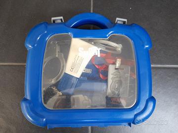 Valigetta per gioco o per carnevale con accessori per giocare al poliziotto: manette, megafono, distintivo, tessera di riconoscimento, Walkie-talkie, lavagnetta tattile cancellabile per appunti e multe.