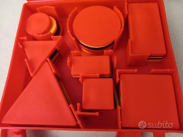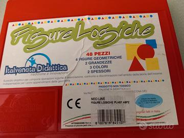 Valigetta composta da 48 pezzi figure geometriche in plastica di 2 grandezze, 3 colori, 2 spessori, un importante sussidio didattico per sviluppare operazioni logiche di associazione, confronto e insiemistica. Nuova.