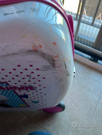 Valigia cavalcabile bimba. Minnie Disney bianca e rosa. Perfettamente funzionante ma abbastanza “vissuta”. Presenta graffi e segni neri, che però probabilmente si possono pulire. Interno e ruote ottimo stato. La cinghia per tirarla ha uno dei due moschettoni rotto. Io la usavo agganciandola solo da un lato