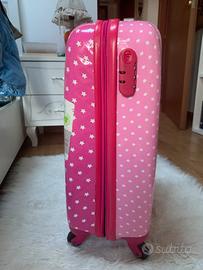 Trolley di Minnie e Paperina, misure 55cm (ruote comprese) x 32 cm x 20 cm, dimensioni classiche dei trolley caricabili come bagaglio a mano. Condizioni ottime fatta eccezione per pellicola davanti che, come si evidenzia nell’ultima foto, tende a sollevarsi, pur non essendo rotta o staccata in nessun punto.