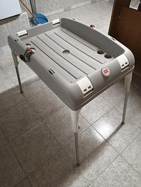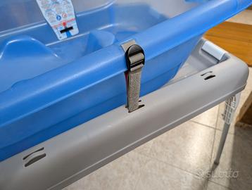 Il cavalletto è pieghevole ed ha le cinghie per bloccare la vasca e può anche essere usato come fasciatoio portatile.