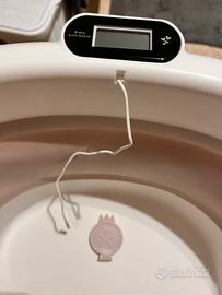 Vasca da bagno per neonato con supporto e cuscino regolabile. Con termometro funzionante e scarico acqua. Vasca e supporto richiudibili per minori ingombri.