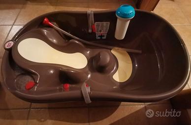 Vendo KIT vasca bagnetto ONDA EVOLUTION + cavalletto per vasca/fasciatoio ONDA EVOLUTION + materassino per il cambio + doccino SPLASH. marca OK BABY. Colori neutri grigio tortora/cioccolato. Usato, ma tenuto come nuovo. Caratteristiche vasca: Seduta ergonomica in gomma antiscivolo a tre punti d'appoggio: 2 ascellari ed 1 inguinale. Doppia posizione da 0/6e da 6/12 mesi. Tappo di scarico rapido. Dimensioni b cm 54 x h 28 x p 94 Caratteristiche cavalletto: Piedini antiscivolo e tubo/imbuto per svuotamento vasca. Lacci di sicurezza per il fissaggio della vasca. Utilizzabile come fasciatoio per il cambio se al posto della vaschetta si appoggia sopra l'apposito materassino. Pratico, maneggevole ed ideale per spazi ridotti. Dimensioni aperto:b cm 61 x h 81 x p 101 Piano vasca interno:b cm 41 x h 10 x p 58 Chiuso:b cm 61 x h 21,5 x p 90