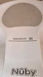 Vaschetta per il bagnetto bianca con indicatore di livello dell'acqua e sedile integrato. Poggiatesta grigio in morbida gomma, puo essere utilizzato fin dai primi mesi.