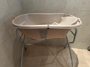 Vaschetta ok baby in plastica resistente con rialzo da terra e possibilità di sganciarla e appoggiarla a terra. Con simbolo che indica la temperatura. Con tubo di scarico per svuotarla. Usata poche volte