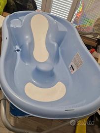 Vaschetta per bagnetto neonati marca OK BABY modello ONDA EVOLUTION, usata ma come nuova, colore celeste. Ergonomica con fondo antiscivolo, tappo per svuotamento rapido, termometro per temperatura acqua incorporato a cristalli liquidi. Utilizzabile in due diverse posizioni a seconda dell'età