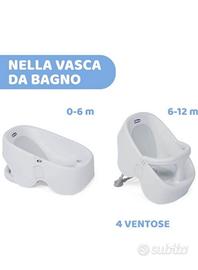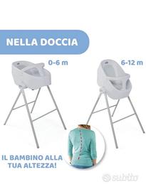 Chicco Bubble Nest è la soluzione innovativa per il bagnetto che rende questo momento più rilassante sia per i genitori che per il bambino. Infatti, con Bubble Nest, il bambino si trova alla stessa altezza dei genitori, che non sono costretti a piegarsi. Bubble Nest può essere usata sia nella doccia, con il pratico supporto, sia nella vasca da bagno, semplicemente staccando la seduta e fissandola con le quattro ventose. È adatta ai bambini da 0 a 12 mesi grazie alle due configurazioni diverse (0-6 mesi e 6-12 mesi) e si trasforma facilmente girando il sedile. La pratica barra a T posta alla base della vaschetta e l'inserto in gomma permettono di mantenere il bambino sempre nella giusta posizione, evitando scivolamenti durante il bagnetto. Dotata di un comodo tappo per facilitare il riempimento e lo svuotamento della vaschetta. Si chiude facilmente in modo compatto e può essere riposta anche all'interno della doccia. �Dimensioni aperto: 55 x 70 x 107 cm. Dimensioni chiuso: 55 x 34 x 110. Peso: 3 kg.