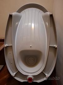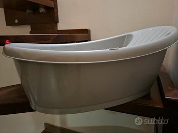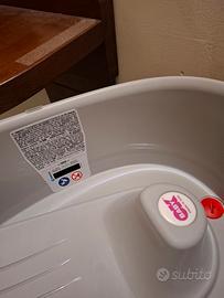Vaschetta da bagno compatta per neonati da 0 a 12 mesi. La vasca Onda baby è dotata di punto d'appoggio inguinale e schienale per sorreggere i neonati fin dal primo bagnetto. Termometro incorporato sull'etichetta laterale. Usata pochissimo. Tappo per svuotare l'acqua. Ideale per chi ha solamente doccia o piccole vasche da bagno. Misure: L cm 42 x H cm 24 x P cm 63.