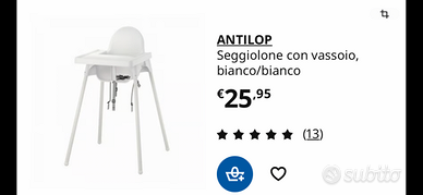 Super offerta!!! Vendo a 65€ se preso tutto in set: - vaschetta per bagnetto - vasino - sedile/riduttore - seggiolone con vassoio - cuscino di sostegno con fodera - materassino per fasciatoio - 2 fodere per materassino fasciatoio - tavolino in legno con 2 sedie - espositore per libri. Consegna a Morciano di Romagna e zone limitrofe, no spedizione.