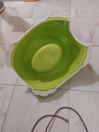 Vasino color verde con dei piccoli animaletto colorati sia sullo schienale che davanti in basso. La parte bianca che sta a terra è in gomma antiscivolo in modo che il vasino rimanga ben fermo a terra. Usato poco perchè ne avevamo un altro.