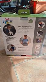 Da usare come riduttore o vasino in casa o in viaggio in quanto pieghevole. Completo di sacchetti raccoglitori e sacchetto per contenere il vasino.
