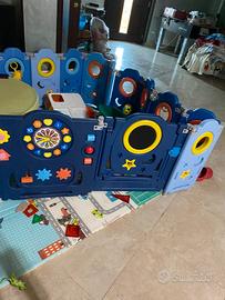 Vendo recinto bambini della Yoleo formato da 2 pannelli da 60 cm ognuno e uno dotato di giochi e 12 pannelli da 30 cm ciascuno…ottime condizioni .Fatto di plastica dura reistente e dotato di ventole che permette un ottima aderenza al pavimento ..privo di graffi o ammaccature