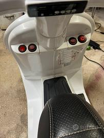 Moto tipo vespa elettrica con qualche segno di usura ma perfettamente funzionante, batteria 12V con carica batterie radio usb fari led 2 velocità rotelle laterali. Per bambini dai 3-6 anni