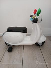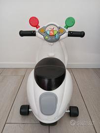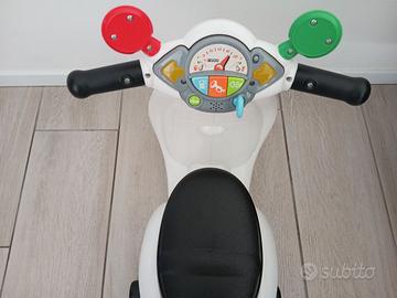 Vespa Primavera Chicco colore bianco 12+ mesi. Ruote di supporto rimovibili e pannello elettronico con suoni realistici (clacson, rifornimento e accensione motore).