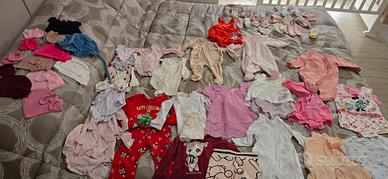 Vendo 8 cappucci, 5 paia di guanti, 56 vestiti misti tra tutine ,body manica lunga ,body maniche corte, maglie maniche corte e lunghe, pantaloni,vestitini ,pagliaccetti ,salopette.