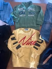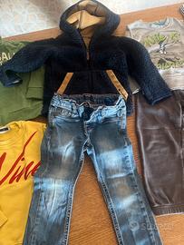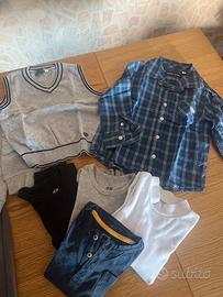 Comprende:1polo bianca manica lunga zara con pantalone grigio,1 pantalone tuta nero,1felpa celeste H&M,1 felpa senza cappuccio verde con scritte,1felpa pelo blu,1pantalone jeans,1completa finlandese grigio Willi il coiote,1 gilè in cotone grigio iDo,1 camicetta blu original marines,1 lupetto bianco,1maglietta blu manica lunga ,2 magliette H&M manica lunga grigio e nero.Tutto in buonissime condizioni!