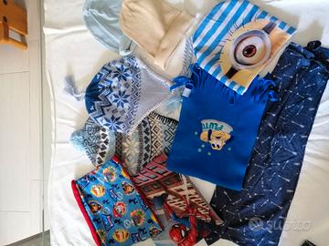 Giacca jeans, maglioncino e 2 pantaloni mai usati. 2 giacche Decathlon con interno in pile. Cerata Spider Man usata 1 volta, 1 felpa e 1 pantalone tuta. 1 sciarpina in cotone e 1 di Pluto in pile, 2 cuffiette leggere, 1 cuffia