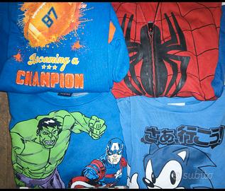 Vendo vestiti da bambino, in blocco o singolarmente, taglia 7/9 anni, 128/134: -2 giacche,1 Benetton invernale una OVS primaverile; -2 camicie; -8 felpe spiderman,sonic e vari; -8 pigiami: marvel,avangers,natale,topolino,batman; -1 pigiama corto avangers; -3 pantaloni jeans lunghi; -30 tshirt minecraft, marvel,pokemon, lego, varie; -8 tshirt manica lunga pokemon e varie; -11 canotte estive pokemon e varie; -13 pantaloncini adidas,pokemon,varie; -termica pantalone e maglia con completo; sportivo corto joma; -3 sciarpine leggere; -calze.