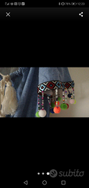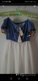 Vestitino carinissimo, sopra color jeans con maniche a spalle scoperte, dettaglio maniche con con pon pon colorati e perline come in foto, gonna leggera viscosa bianca, corta davanti e più lunga dietro. In ottime condizioni.