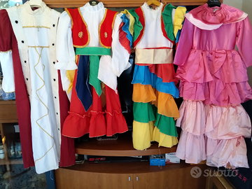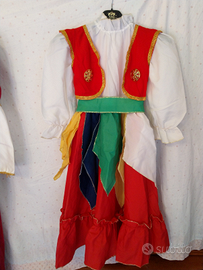 Vestitino di carnevale con cappellino, gilettino, che si può togliere dal completino, e cinturino verde. Età 3- 4 anni, altezza 94cm. giro vita 66 cm. La vestibilità dipende non solo dall'età della bambina ma anche dalla sua conformazione.