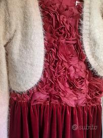 Vestito elegante bambina con coprispalle. Il vestito ha maniche corte, corpetto con motivi a fiore in rilievo. La gonna es foderata è ha in tulle di sottogonna per dare volume. Usato solo in un'occasione. Tg 8-9 anni. Rosso bordeaux.