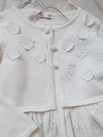 Vendo vestitino elegante completo di coprispalle per bambine di 3 anni, di colore bianco, in cotone e lino, guarniti entrambi di fiorellini in organza. Abbottonato sulle spalle con bottoncini, allacciato in vita con fasce da annodare, fornito di sottogonna. La lunghezza è di cm 51. Usato pochissimo è in ottime condizioni, igienizzato. Vendo per cambio taglia.