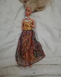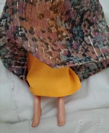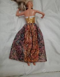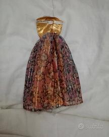 Corpetto dorato a cuore e gonna con strisce verticali dorate e fiori, Sottogonna giallo scuro Dalla collezione Designer Originals Gold Spun Utilizzato ma ben conservato Nessuno strappo/scucitura Bambola non inclusa No altri accessori