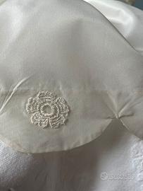 Bellissimo vestito da battesimo per bambine di fattura sartoriale mai indossato, realizzato in moiré di seta pura bianco panna, decorato con pizzo Valenciennes e nastro di colore azzurro Tiffany 100% seta.